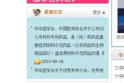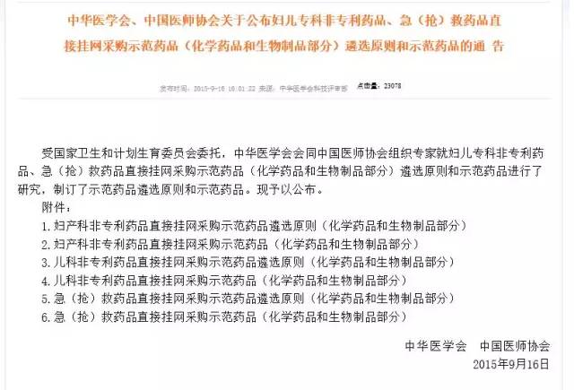 昨日下午4时,中华医学会官网悄然上架一条公告:中华医学会、中国医师协会关于公布妇儿专科非专利药品、急(抢)救药品直接挂网采购示范药品(化学药品和生物制品部分)遴选原则和示范药品的通 告