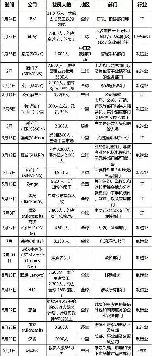 2015年全球部分企业裁员盘点(表格来源:搜狐财经)