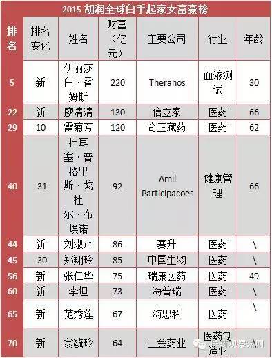 外国的两个分别是美国验血公司Theranos的伊丽莎白•霍姆斯,她以220亿元的总财富位居全球白手起家女医药富豪的第一名,总榜单的第5名,另一个是巴西的医疗保健公司Amil Participacoes的杜耳塞•普格里斯•戈杜尔•布埃诺,她的总财富是92亿元。