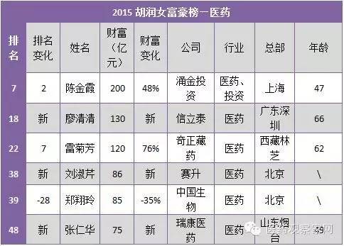 而在白手起家榜单中,女医药富豪们共有10位,其中中国占了8个。除了奇正藏药的雷菊芳和中国生物的郑翔玲是之前上过榜的,其余八位都是今年新上榜的。