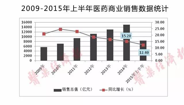 医药商业年销售总额自2011年起增速逐年放缓,从该年的24.6%逐步递减到2014年的15.2%,2015年上半年下降到12.4%。