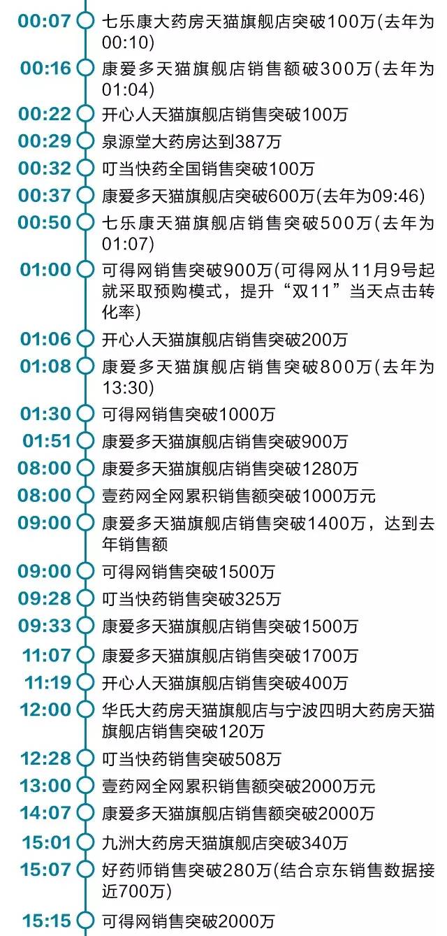 目前,在医药电商方面,虽然具体的天猫交易数据无从得知,但根据康爱多、七乐康、开心人等多个商家的销售业绩来看,医药电商今年“双11”的销售额较去年均有大幅增长,多数医药电商商家在当天中午12点前已经完成去年同期销售额,其“双11”终极销售目标甚至是去年销售额的3倍以上。以康爱多为例,2014年“双11”天猫销售额为1400万,今年目标则提升到近5000万。康爱多根据生意参谋和内部预估数据显示,今年“双11”当天全网及线下门店合计销售额超过6253万元。其中,天猫医药馆销售额突破3053万元,自建平台,包括官网、康爱多掌上药店及WAP网站销售额合计超3100万元,京东及其他第三方旗舰店以及参与活动的线下O2O门店销售额合计超100万元。