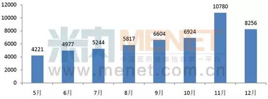 截至2015年6月中旬,从CFDA的网站数据显示,有307家企业获得网上药店的证书,比2013年底的150家翻了一倍,且这个数字每月逐渐递增,说明越来越多的企业已经从观望阶段转为实战阶段,医药电商化成大势所趋。随着各大电商巨头和各路资本的介入,对消费者网上购药习惯的培养,市场扩张的速度不容小觑。业界最期待的医药电商政策利好《互联网食品药品经营监督管理办法》虽未正式发布,但一旦网上医保和处方药销售等得以开禁,国内医药电商将迎来井喷式发展。2014年5月-2014年12月天猫医药馆的销售规模(万元)