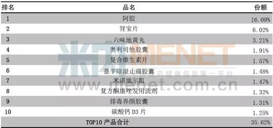 2014年天猫医药馆前十品种市场份额占整个天猫医药馆市场份额的35.62%,其中第一名的是阿胶16.09%,第二名是肾宝片6.03%,第三名是六味地黄丸3.21%。