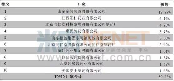 从2014年天猫医药馆前十厂家市场份额显示,TOP10厂家合计占据了天猫医药馆整体市场份额的39.45%。其中山东东阿阿胶股份有限公司以12.77%的份额遥遥领先居首位;第二名是江西汇仁药业有限公司6.16%,第三名是北京同仁堂科技发展股份有限公司制药厂4.70%。