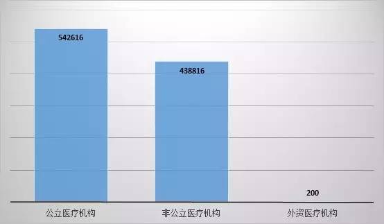根据《2015中国卫生和计划生育统计年鉴》的数据,截止2014年底,我国公立医疗卫生机构有542616家,其中医院有13314家,非公立医疗卫生机构有438816家,其中医院有12546家。