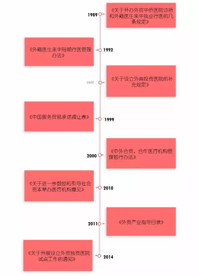 中国最早的有关医疗行业市场准入的法律文件,是1989年制定的《关于开办外宾华侨医院诊所和外籍医生来华执业行医的几条规定》,规定了外籍医师可以来华行医,并且外商在华试办外资医疗机构也得到了初步允许。
