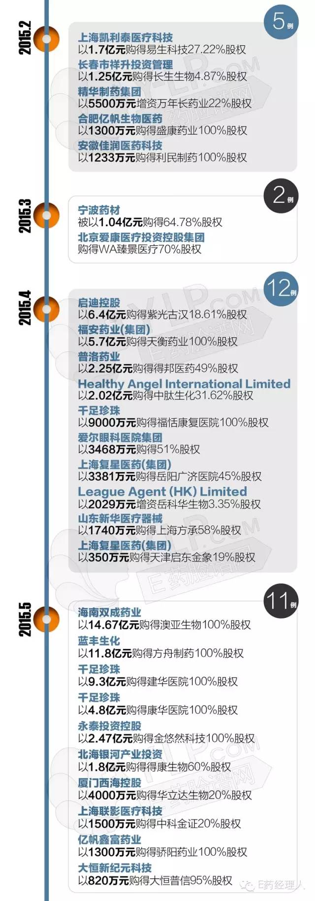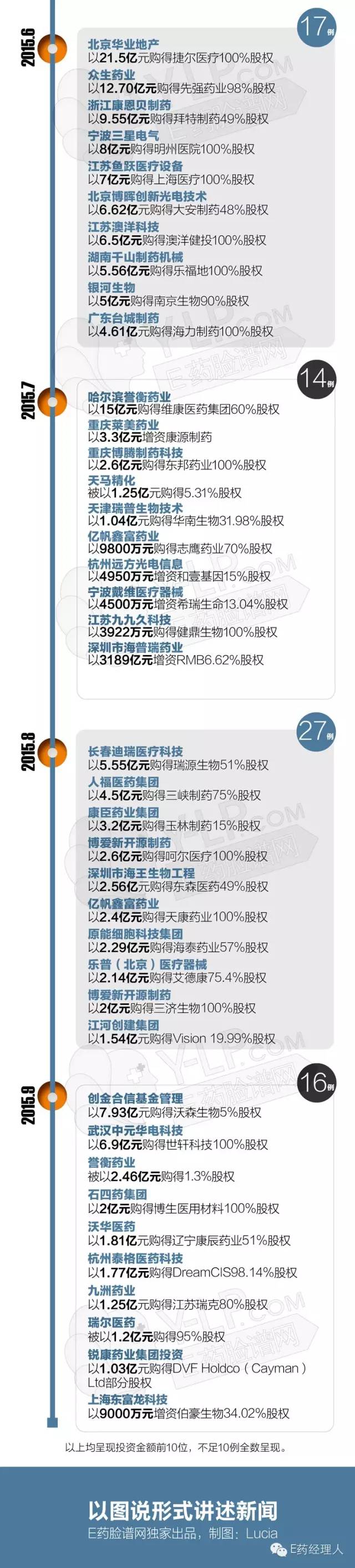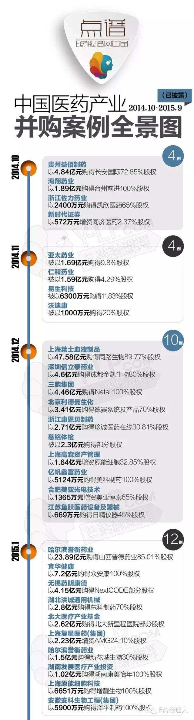 2014年10月-2015年9月,中国医药产业共披露134起并购案例。其中,2014年10月有4例,2014年11月有4例,2014年11月有10例,2015年1月有12例……具体如下图所示: