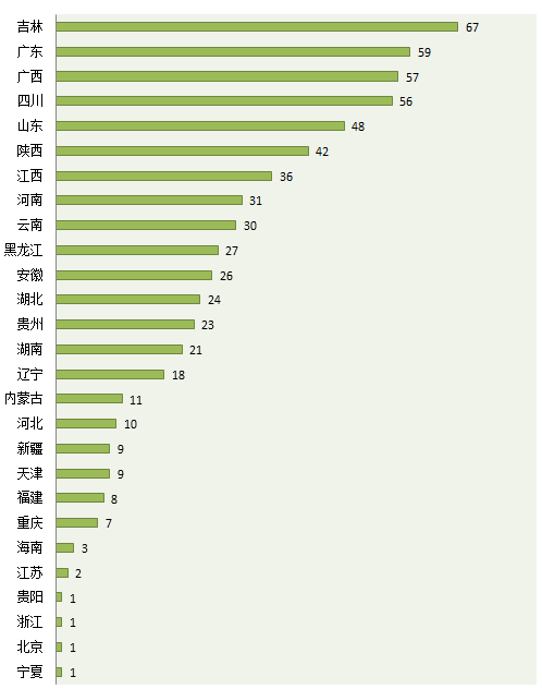 咸达数据V3.2对已过2010年版GMP的数据跟踪发现,目前已有1072家企业获得颗粒剂的GMP证书,拥有提取的GMP证书有917家企业,同时拥有提取和颗粒剂GMP的生产厂家有628家。吉林省有潜力扩大生产范围的企业数最多,共67家;广东有59家排第二;广西有57家企业,四川有56家,山东有48家,分别位列第3和第5。