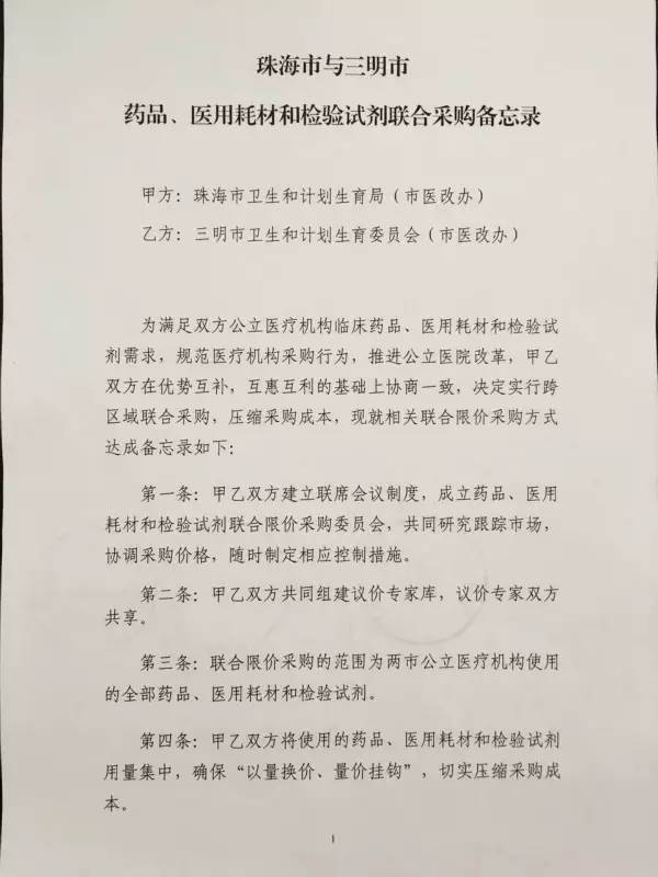 在健康三明网站显示的备忘录上,我们看到珠海与三明就药品、医用耗材和检验试剂达成联合采购,双方成立联合限价采购委员会,将上述三种医药商品集中起来,确保以量还价、量价挂钩。双方将互通使用及价格信息,优先采购同质低价的产品,并约定结算期限为60天。