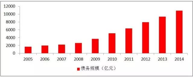 根据近十年的中国卫生统计年鉴显示,我国公立医院负债规模从2005年1697亿元开始逐年急剧上升,发展到2014年债务总规模已经超过一万亿元大关,达到了10918亿元(图1),年均债务复合增长率达到20.5%;而同期公立医院的总收入年均收入复合增长率却只有16%,债务的增长速度明显快于收入的增长速度。