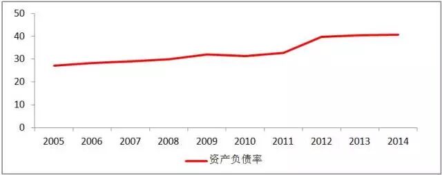公立医院在债务快速增加的同时,其资产负债率也是迅速增长,从2005年27.12%上升到2014年的40.80%(图2),可以看出公立医院规模的扩张并不是依靠医院自身收支结余的积累以及政府财政资金的补助,而是依靠自身不断借债进行扩张。