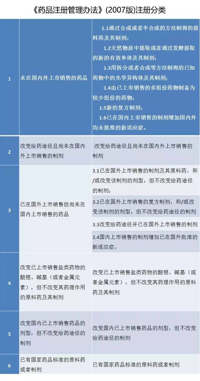 《药品注册管理办法》(2007版):药品注册申请包括新药申请、仿制药申请、进口药品申请及其补充申请和再注册申请。新药申请,是指未曾在中国境内上市销售的药品的注册申请。对已上市药品改变剂型、改变给药途径、增加新适应症的药品注册按照新药申请的程序申报。仿制药申请,是指生产国家食品药品监督管理局已批准上市的已有国家标准的药品的注册申请。