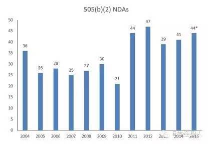 在美国,2014年FDA按照505(b)(2)途径批准了41个药物,2015年保持强劲势头,44个药物得到批准。下图为2004-2015年按照505(b)(2)途径批准药物情况。