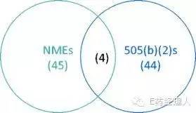 2015年FDA新药批准数量有很大提升,共有45个新药获得批准,而按照505(b)(2)途径批准的药物数量与新药批准的数量基本相当。在45个新药中,有4个是通过505(b)(2)途径批准的,如下图所示。