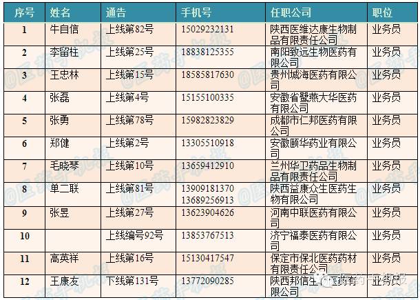 山东省药监局3月19日发布的《关于庞某等非法经营疫苗案有关线索的公告》,曝光了上线人员107条,下线人员193条。总局初步确认了其中12人的身份,分别为12家药企的业务员。具体如下所示: