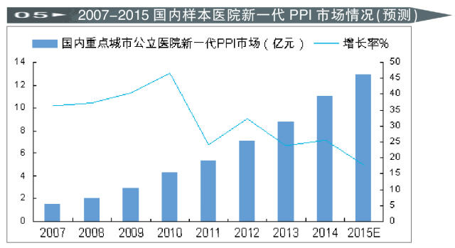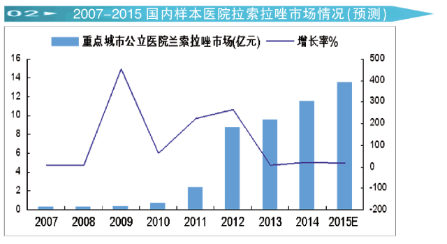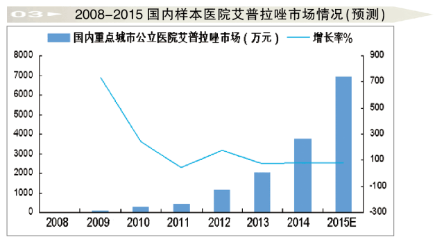 据HDM系统数据,艾普拉唑在国内重点城市公立医院抗酸及溃疡市场中一路高走,2010年排名第29位,2012年进入第16位,2014年同比上一年增长82.43%,并快速进入第9位,预测2015年将进入第7位。另据IMS医院用药数据,自上市以来艾普拉唑每年销售收入复合增长率达65%以上,预计2015年全年销售额约2亿元。
