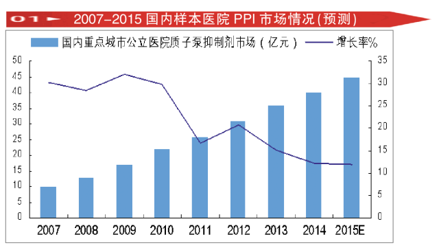 据HDM系统数据,目前国内重点城市公立医院消化类药物市场居第一位的是兰索拉唑,2014年用药金额为11.53亿元,同比上一年增长20.60%;2015年1-3季度用药金额已近9亿元,仍是国内医院质子泵抑制剂市场上的亮点。