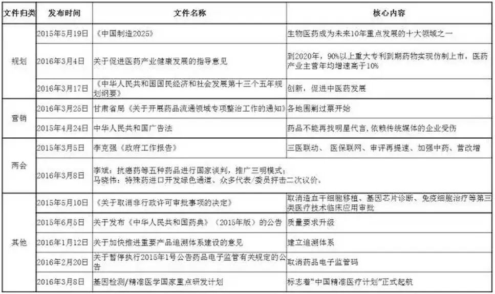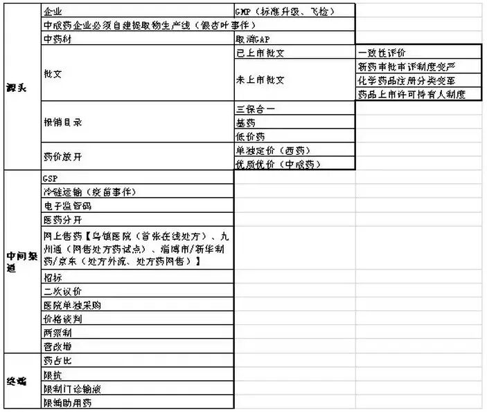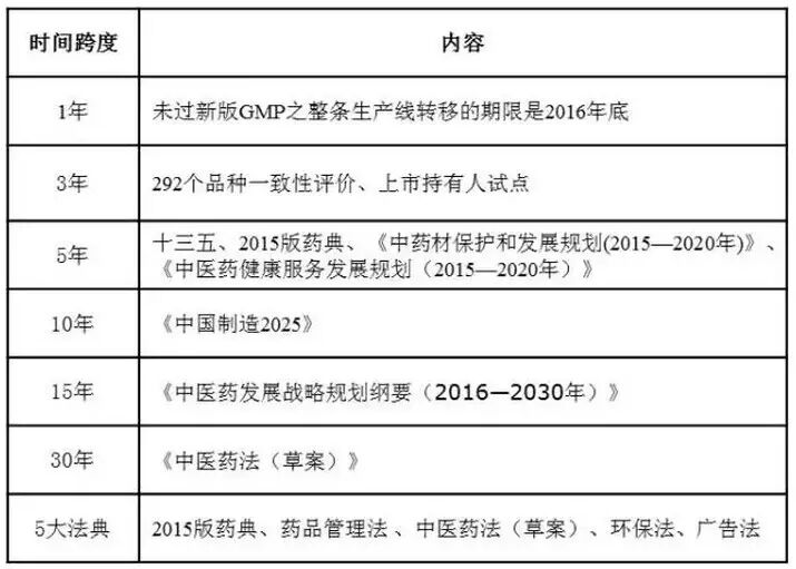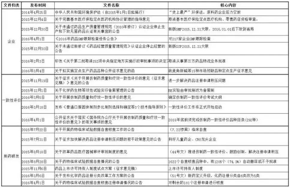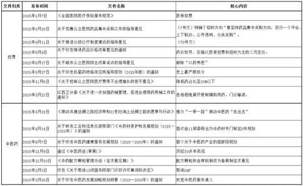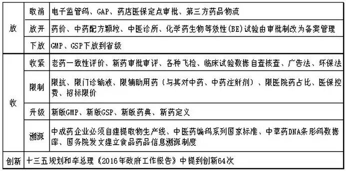 2015年以来,发布的政策法规主要围绕质量、创新、控费、中医药这四大核心主题,其目的在于深化医改,也就是要解决看病难、看病贵和医保透支的问题,而改革的进程却呈现出由医改到药改再控费,最后寄厚望于中医药(甘肃模式)的格局,就制药工业而言,化药向前看(国际化),中药向后望(重在传承)成为必然选择。