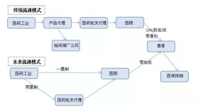 相比之下,在未来的流通模式中,两票制砍去了产品代理这一环节,药品从出厂到医院只许开两次发票,一是从生产企业到流通商业,二是从流通商业开到医院,并且取消药品加成。