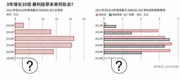 从2009年问世至今,青海春天先后经历“身份门”“超标门”“叫停门”等多轮争议,也曾创造业绩神话——“极草”牌28克装“至尊含片”售价高达29888元,一克1054元,超过黄金价格3倍;三年净利润增长30倍,从2011年的1159.61万元增长至2014年的3.66亿元;2014年9月,借壳上市成为“虫草第一股”,股价最高冲上50元顶峰,总市值超300亿元。