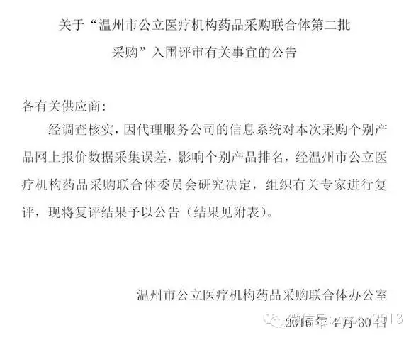 2016年浙江省温州市关于公立医疗机构药品采购联合体第二批采购的补充公告