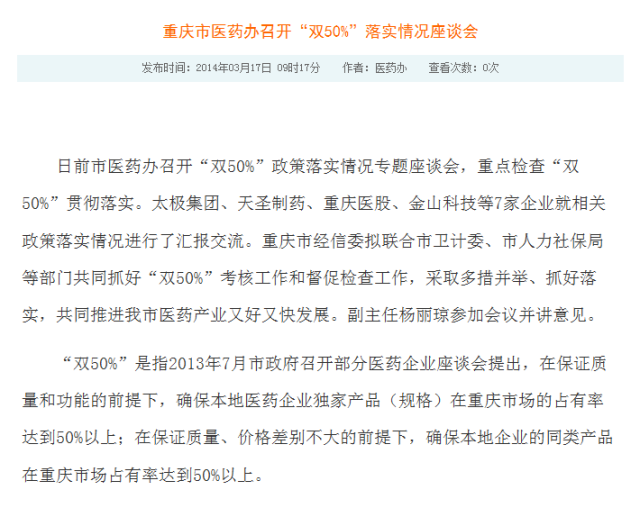 重庆:经信委参与执行当地医药产业发展政策,考核监督医疗机构地产药品的“双50%”政策