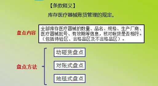 第六章 入库、贮存与检查 第四十六条 企业应当对库存医疗器械定期进行盘点,做到账、货相符。 【条款释义】