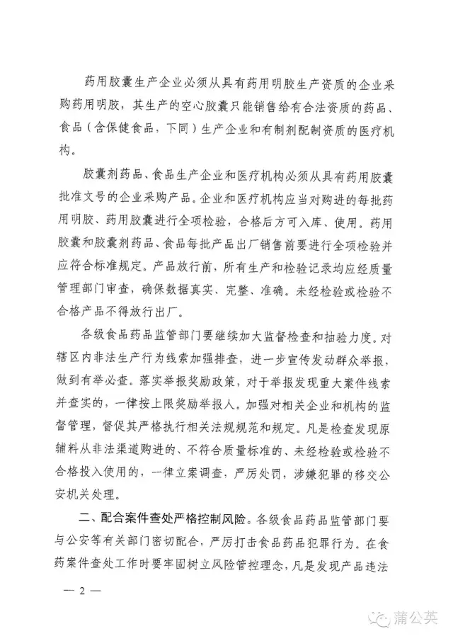 一、落实企业主体责任加强监督管理。企业要进一步健全质量管理体系,严格供应商审计和质量评估,落实主体责任。药用明胶生产企业必须严格按照中国药典规定的工艺生产,产品必须检验合格后方可销售,严禁使用不合格原料生产药用明胶,严禁用工业明胶假冒药用明胶。