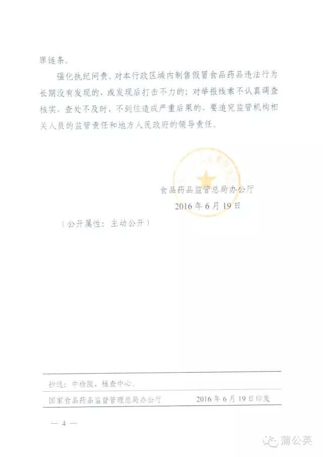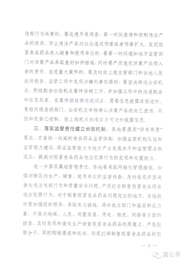三、落实监管责任建立长效机制。各地要落实“四有两责”要求,完善统一权威的食品药品监管体制,加强监管机构队伍和监管能力建设,保证监管能力与地方产业发展水平和监管需求相适应,提高对假冒食品药品违法犯罪行为的发现和处置能力。