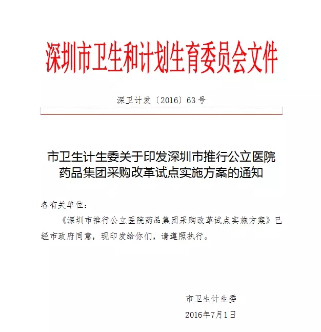 7月1日,深圳市卫计委下发了《深圳市推行公立医院药品集团采购改革试点实施方案》(以下简称:《实施方案》)的通知,要求从本月起,通过推行药品集团采购,实现药品降价30%以上。争取到2017年,全市公立医院药品收入占业务收入的比例下降到27%以内。