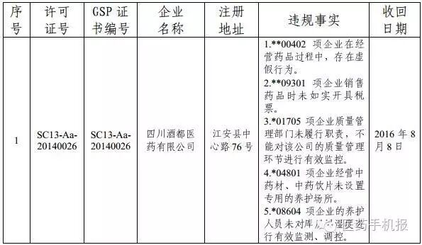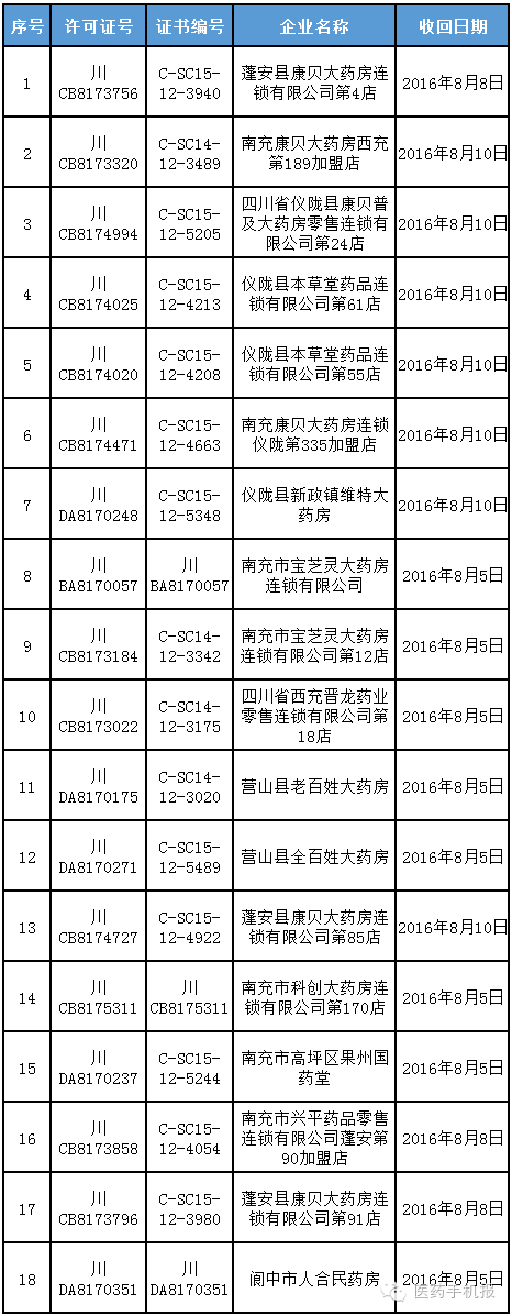 《收回GSP认证证书公告(七)》指出,蓬安县康贝大药房连锁有限公司第4店、南充康贝大药房西充第189加盟店、四川省仪陇县康贝普及大药房零售连锁有限公司第24店、仪陇县本草堂药品连锁有限公司第61店、仪陇县本草堂药品连锁有限公司第55店、南充康贝大药房连锁仪陇第335加盟店、仪陇县新政镇维特大药房、南充市宝芝灵大药房连锁有限公司、南充市宝芝灵大药房连锁有限公司第12店、四川省西充晋龙药业零售连锁有限公司第18店、营山县老百姓大药房、营山县全百姓大药房、蓬安县康贝大药房连锁有限公司第85店、南充市科创大药房连锁有限公司第170店、南充市高坪区果州国药堂、南充市兴平药品零售连锁有限公司蓬安第90加盟店、蓬安县康贝大药房连锁有限公司第91店、阆中市人合民药房等18家企业,严重违反《药品经营质量管理规范》(局令l3号)的有关规定。