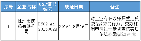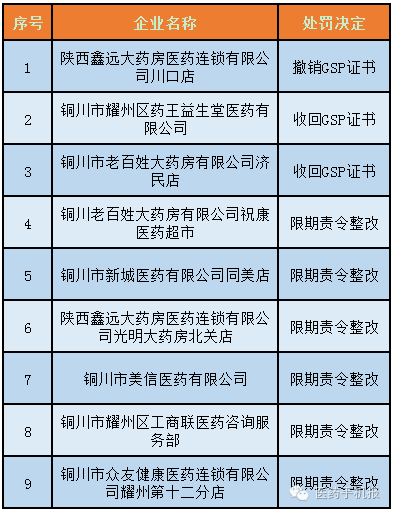 8月15日,陕西省铜川市药监局发布《关于对2016年第二轮药品零售经营企业飞行检查结果的通告》,7月底至8月初开展的第二轮飞检涉及全市3个区县、9家药品零售经营企业。其中,有1家被撤销GSP证书、2家被收回GSP证书、6家被责令限期整改。