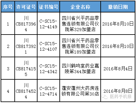 《撤销GSP认证证书公告(六)》指出,四川省兴平药品零售连锁有限公司仪陇第329加盟店、四川省兴平药品零售连锁有限公司仪陇第189加盟店、四川鹤鸣堂药业嘉陵第344加盟店、蓬安蓬州大药房连锁有限公司第30店等4家企业,严重违反《药品经营质量管理规范》规定。