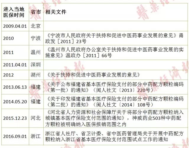已进入医保的还有重庆、安徽、广州等地,而山西、广东、福建等省参照中药饮片政策对配方颗粒给予报销。