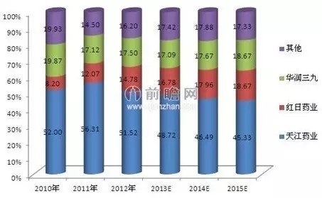 2010-2015年中药配方颗粒竞争格局及预测(单位:%)