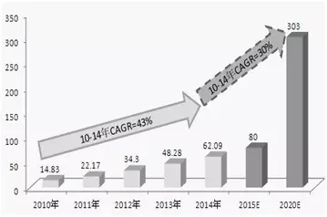 2010-2020 年中药配方颗粒市场规模预测(单位:亿元)
