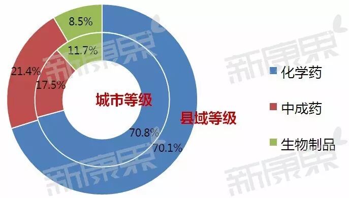 化药是等级医院用药市场的主流,在城市等级和县域等级都达到70%以上的占比。城市等级医院化药和生物制品市场占比高于县域等级医院。