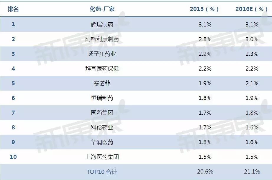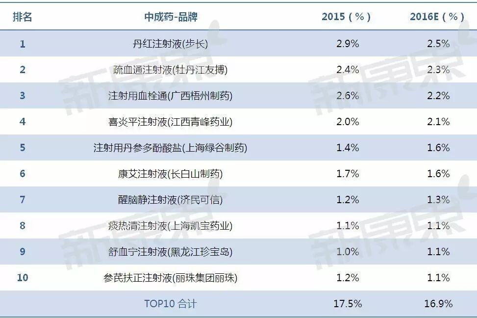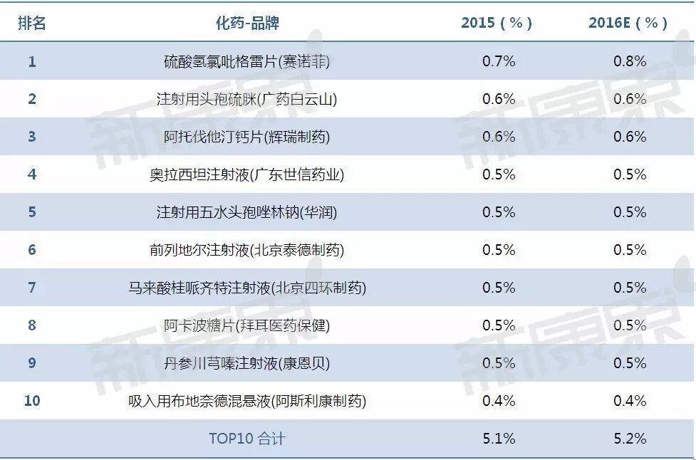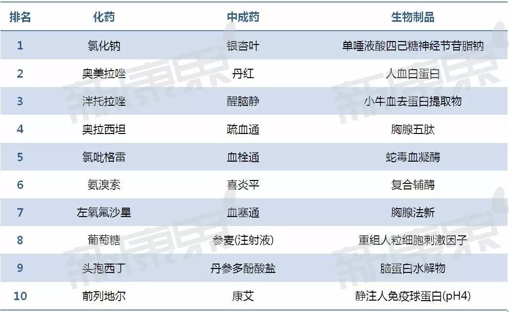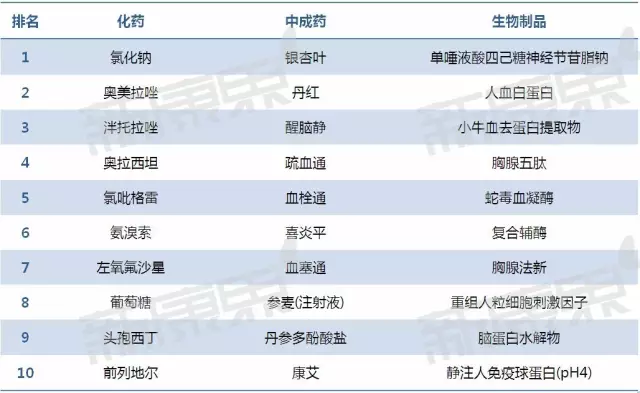 等级医院TOP10化药/中成药/生物制品通用名排行(按销售额份额排名)