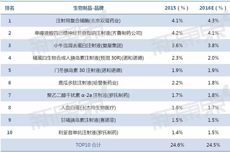 等级医院TOP10生物制品品牌销售额份额排行榜