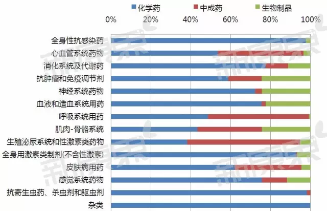 2015年等级医院各品类化药/中成药/生物制品市场份额