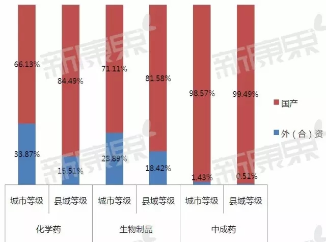 等级医院用药市场中,外(合)资企业销售份额占24%,即绝大部分药物市场被国内企业占领。无论是化药、中成药还是生物制品,城市等级医院的外资企业销售占比均高于县域等级,与之对应的,县域等级医院的国产药物普及程度比城市等级医院更高。