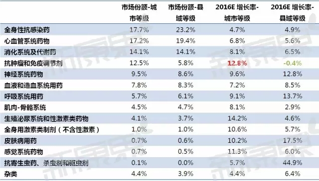 城市、县域等级医院用药各品类市场分布大致相似。城市等级医院抗肿瘤和免疫调节剂份额、增长速度均明显高于县域等级。12.5%的市场占比,增速12.8%,抗肿瘤和免疫调节剂品类可能是驱动城市等级医院用药市场2016年增速超越县级医院的主要市场之一。