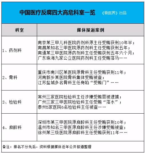 实际上,除了检验科,近年来,医院的药剂科、骨科、麻醉科,也都是医疗腐败的重灾区,相关科室领导落马的也不在少数。