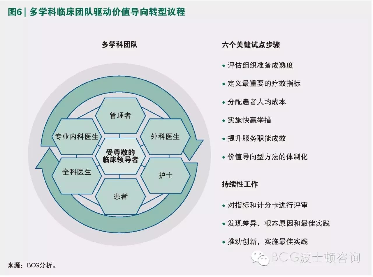 据我们的经验,试点疾病群最初经历六个步骤,需要在大约6-9个月内集中开展工作。在此期间,组织根据自身实际情况调整和细化方法,并进行测试,通常需要两轮患者群试点。当然,一家大型医院网络通常要应对200多种疾病,要实现逐一完全覆盖并对IT和医院组织进行重大改革,需要更长时间——大约两到三年持续的努力。为了支持机构进行这一重大转型,BCG成立了BCG医疗价值中心,旨在帮助医院和其他医疗机构的高管,建立推动转型所需的经验和能力。除了对医院管理层和变革团队提供实践辅导,并为工作组成员进行培训。此外,该中心还将协调医疗机构之间的交流,本着持续改进的精神互相学习。