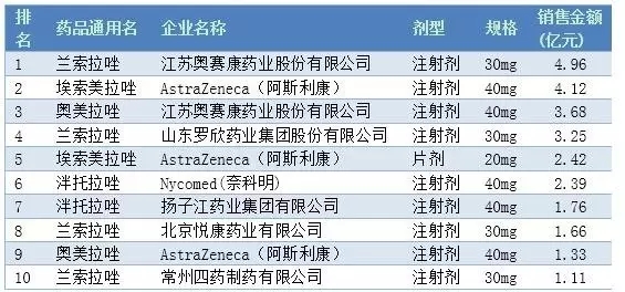 2015年样本医院质子泵抑制剂中用药金额最高的三个品种为江苏奥赛康的兰索拉唑注射剂、阿斯利康的埃索美拉唑注射剂、江苏奥赛康的奥美拉唑注射剂,用药金额分别为4.96亿、4.12亿、3.68亿。质子泵抑制剂作为相对成熟的一个领域,国产和进口产品齐头并进,各自占据一定的市场地位。