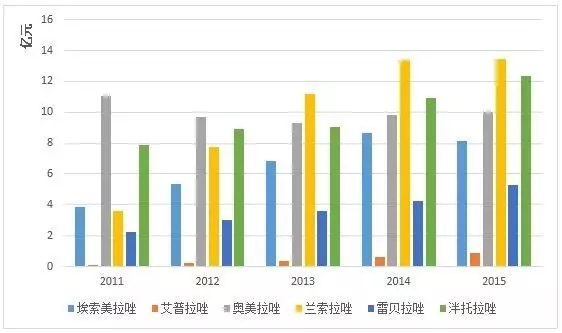 2015年,用药金额最高的质子泵抑制剂为兰索拉唑,其次是泮托拉唑,再次是奥美拉唑。兰索拉唑由日本武田公司开发,1992年首次在日本上市,1995年进入中国,2008年国产兰索拉唑上市。其作用机制独特,特异性高,抑酸作用强、时间久,价格便宜,因此一直受到医生和患者的青睐,在质子泵抑制剂市场上势头强劲。从医院用药情况来看,兰索拉唑用药金额增速明显,2013-2015年均处于质子泵抑制剂用药金额第一位,2015年用药金额更是达到了13.47亿元。而奥美拉唑作为第一个上市的质子泵抑制剂,形势却不容乐观。2011年奥美拉唑还是一枝独秀,但近年来在新产品的冲击下,用药金额呈现下降趋势,2015年样本医院用药金额为10.3亿元(图3)。