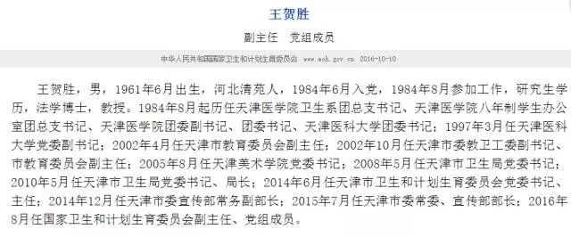 摘要2016年,国家卫计委多个部门调整人员,健康界梳理出最新具体名单。来源:健康界 作者:郝兰兰 2016年,国家卫计委多个重要岗位的负责人发生变动,健康界根据公开资料对最新领导班子进行了梳理。 国家卫计委委领导职务变化今年8月初有消息称,原天津市委常委、委员王贺胜同志不再担任该职务。目前,王贺胜担任的两个职务分别是“国务院医改办主任”与“国家卫计委副主任”。