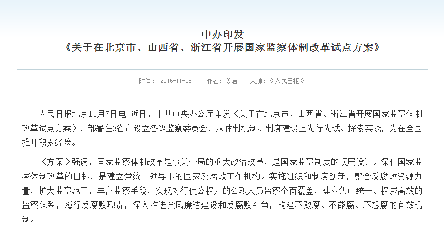 11月7日晚,中国中央办公厅印发了《关于在北京市、山西省、浙江省开展国家监察体制改革试点方案》。部署在3省市设立各级监察委员会,从体制机制、制度建设上先行先试、探索实践,为在全国推开积累经验。