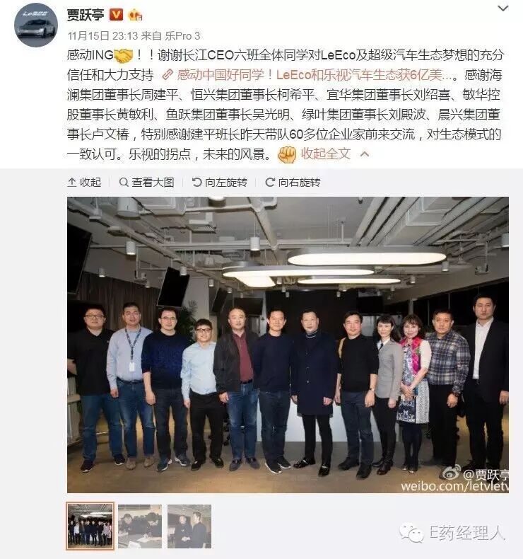 11月15日,贾跃亭发了一条微博,称其长江商学院的同学为其融资6亿美元,继续支撑乐视的LeEco和乐视汽车生态后续的发展,并点名感谢了7位企业家朋友,这之中,医药产业的有绿叶制药董事长刘殿波和鱼跃集团董事长吴光明。其实这两天,吴光明不止和乐视发生资本链接,除此之外,还并购了一家医用耗材公司。